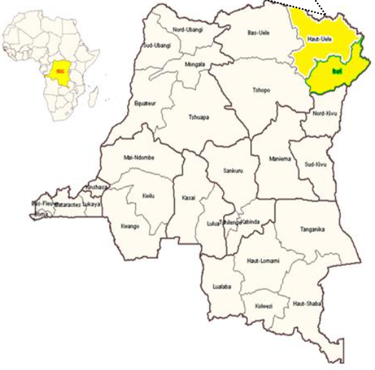 The smaller left map shows the location of the Democratic Republic of Congo (DRC) within Africa. The larger map shows where Haut-Uélé and Ituri province are located within DRC.
